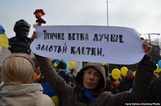 Знову осяйні обличчя – які вірять, які не хочуть війни, які співають гімн України акапельно й напам’ять читають вірші Шевченка. Вони скандують вже інші гасла: “Бойкот референдуму!”, “Ми поважаємо всіх” (російською), “Слава Україні!”.