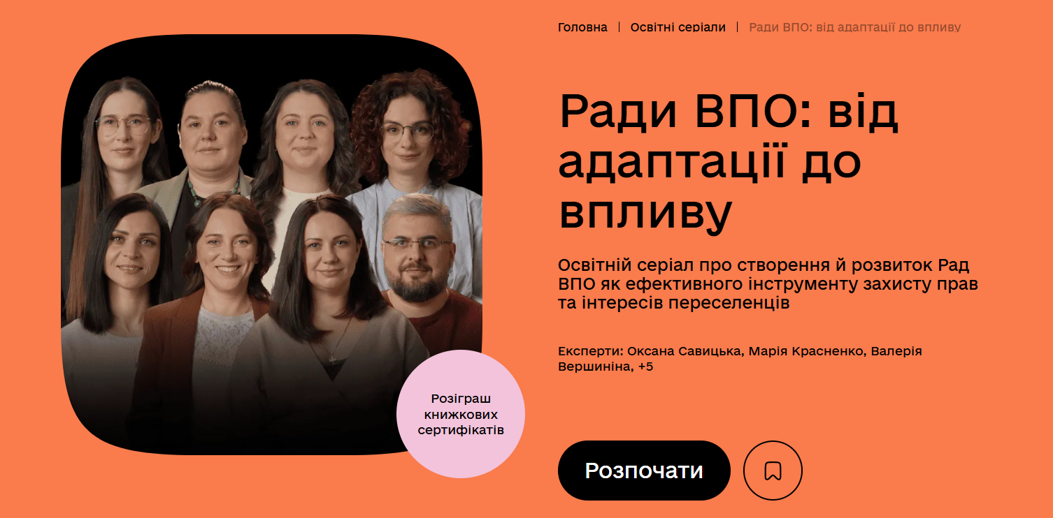 На порталі Дія.Освіта громадяни України можуть пройти освітній серіал про створення й розвиток Рад ВПО як ефективного інструменту захисту прав та інтересів переселенців.