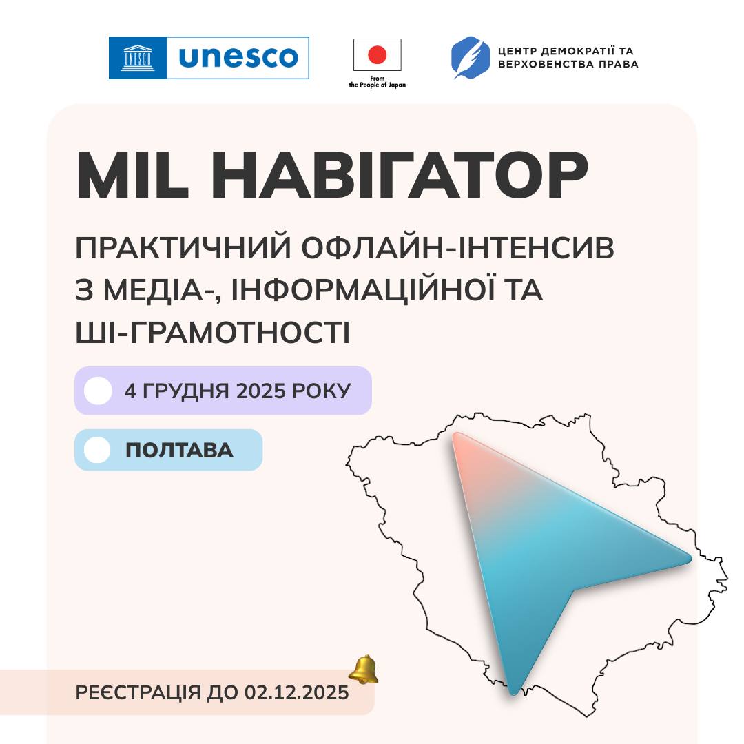 4 грудня 2025 року мешканців міста Полтави запрошують на тренінг “MIL Навігатор: практичний офлайн-інтенсив з медіа-, інформаційної та ШІ-грамотності”.