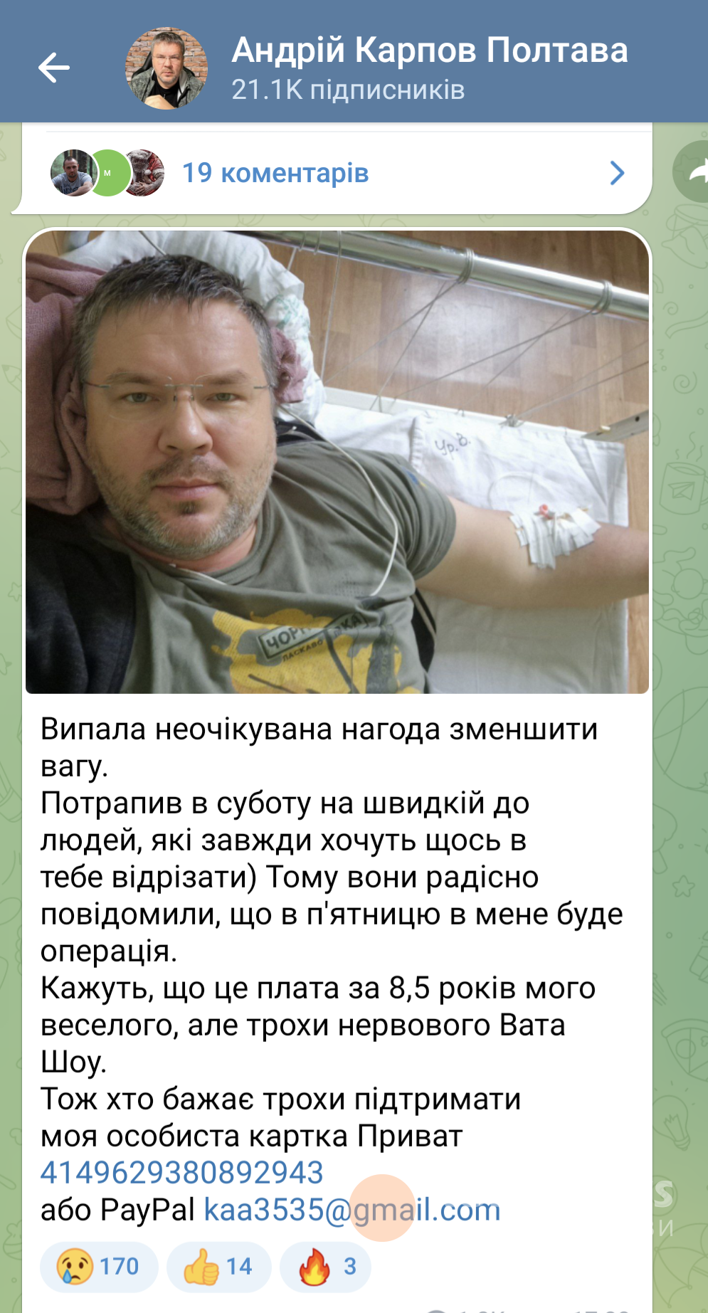 Реакція Карпова була емоційною: він опублікував пост, у якому стверджував, що журналісти нібито написали про операцію “зі зміни розміру статевого органу” – хоча ані такого заголовка, ані подібного змісту в публікації не було. Ба більше, у соцмережах він заявив, що редакція “Кола” збрехала і про його заробітну плату: мовляв, журналісти писали, що він отримує понад 100 тисяч гривень, хоча в реальності, як він каже, зарплата “на руки” в нього становила лише 16 тисяч.