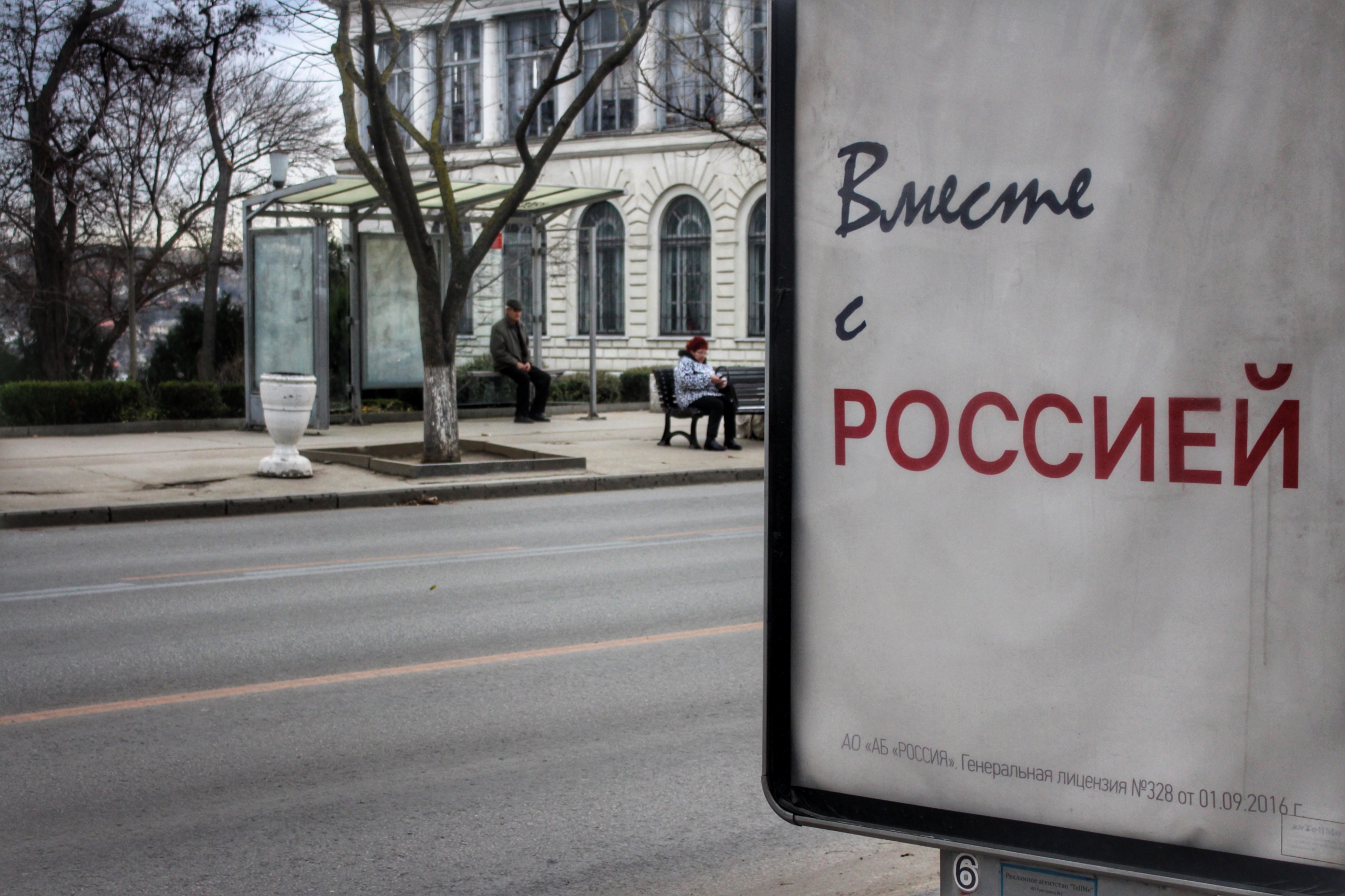 Рекламний щит у Севастополі. Фото: Олександра ЄфименкоУ перший рік окупації Криму, за даними Інституту масової інформації, російські бойовики викрали 11 працівників медіа, яких згодом відпустили. У 2016 році почалися арешти з тривалими термінами – Володимир Дудка, Олексій Бессарабов і Дмитро Штибліков отримали по 14 років позбавлення волі. У 2017 році почалися масові переслідування громадянських журналістів, які тривають дотепер. Найбільші терміни – по 19 років – отримали громадянські журналісти Ремзі Бекіров і Марлен Асанов.