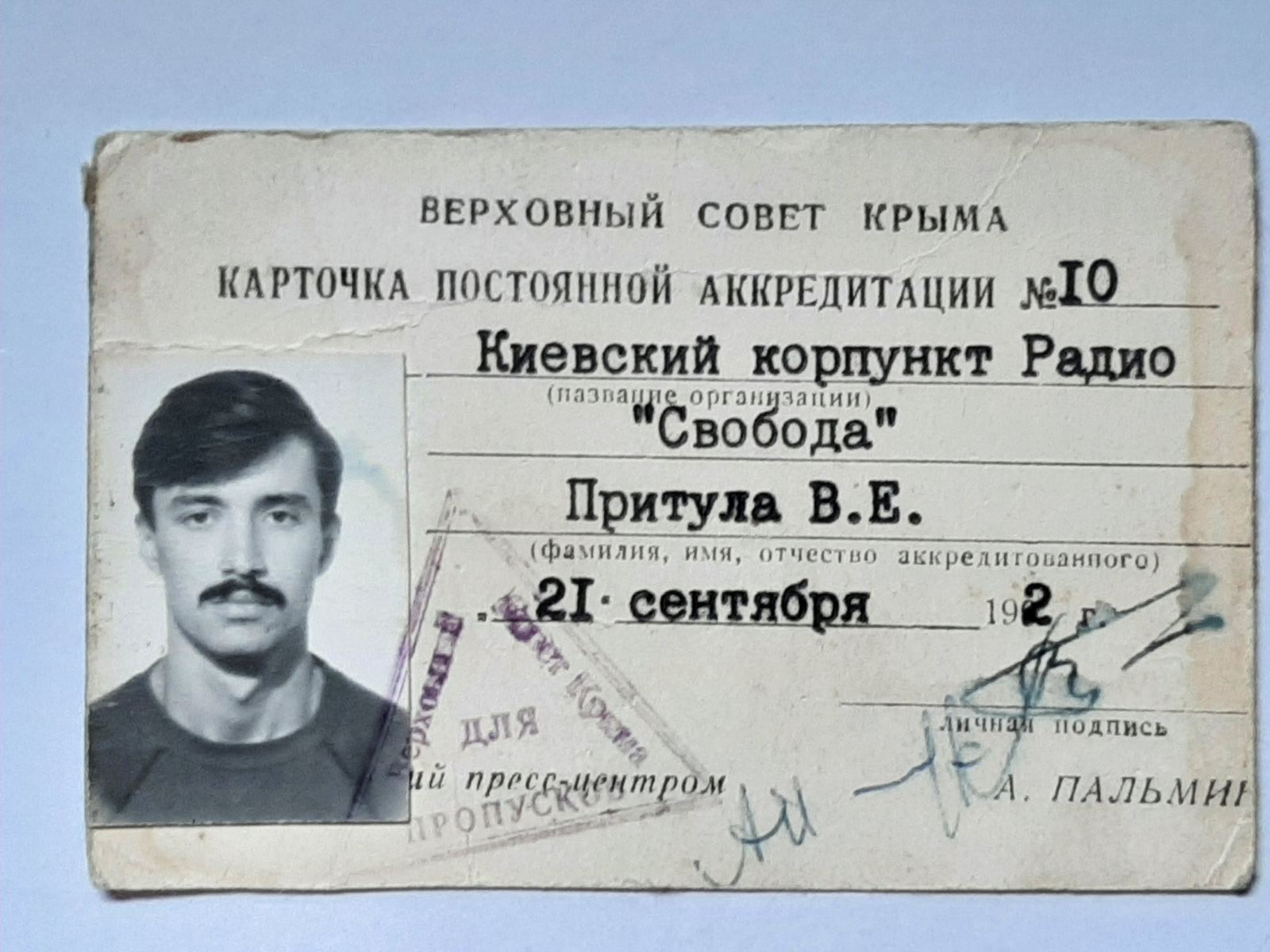 Акредитація у Верховну Раду Криму Володимира Притули. З особистого архіву журналістаПісля смерті колеги Олександра Пілата Притулу переконали стати кореспондентом “Голосу України” в Криму. Робота в державному медіа виявилася нецікавою і нетривалою – за рік він залишив цю позицію і повернувся до незалежних форматів журналістики.