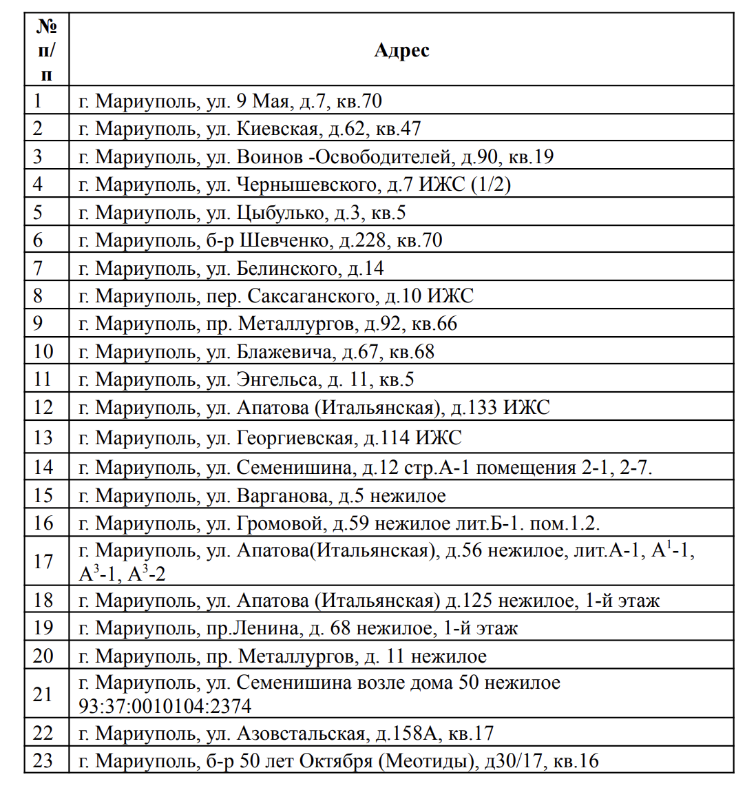 Перелік нерухомого майна, яке має ознаки безгосподарності, на думку “адміністрації міського округу Маріуполь ДНР”, 18 лютого 2026 рокуНині окупанти регулярно публікують списки так званого безхазяйного майна, що охоплюють сотні квартир. Щоправда, віднедавна термін “безхазяйне житло” більше не використовується – тепер процес експропріації приватної власності маріупольців називається “розширення переліку компенсаційних квартир”.
