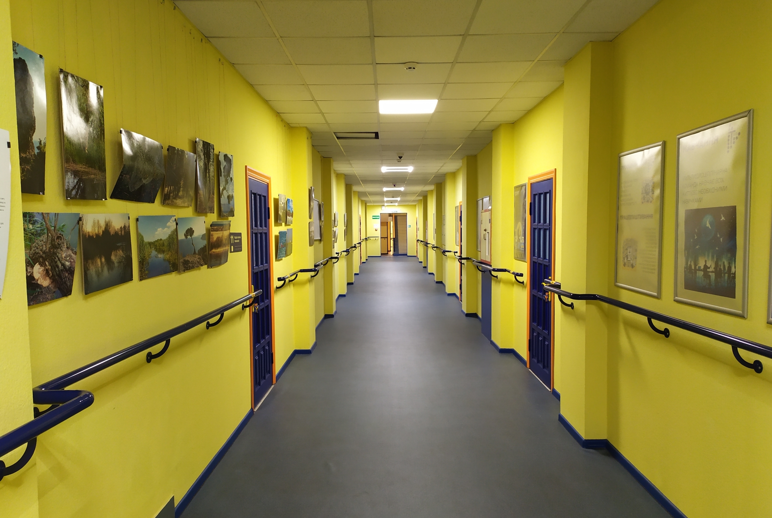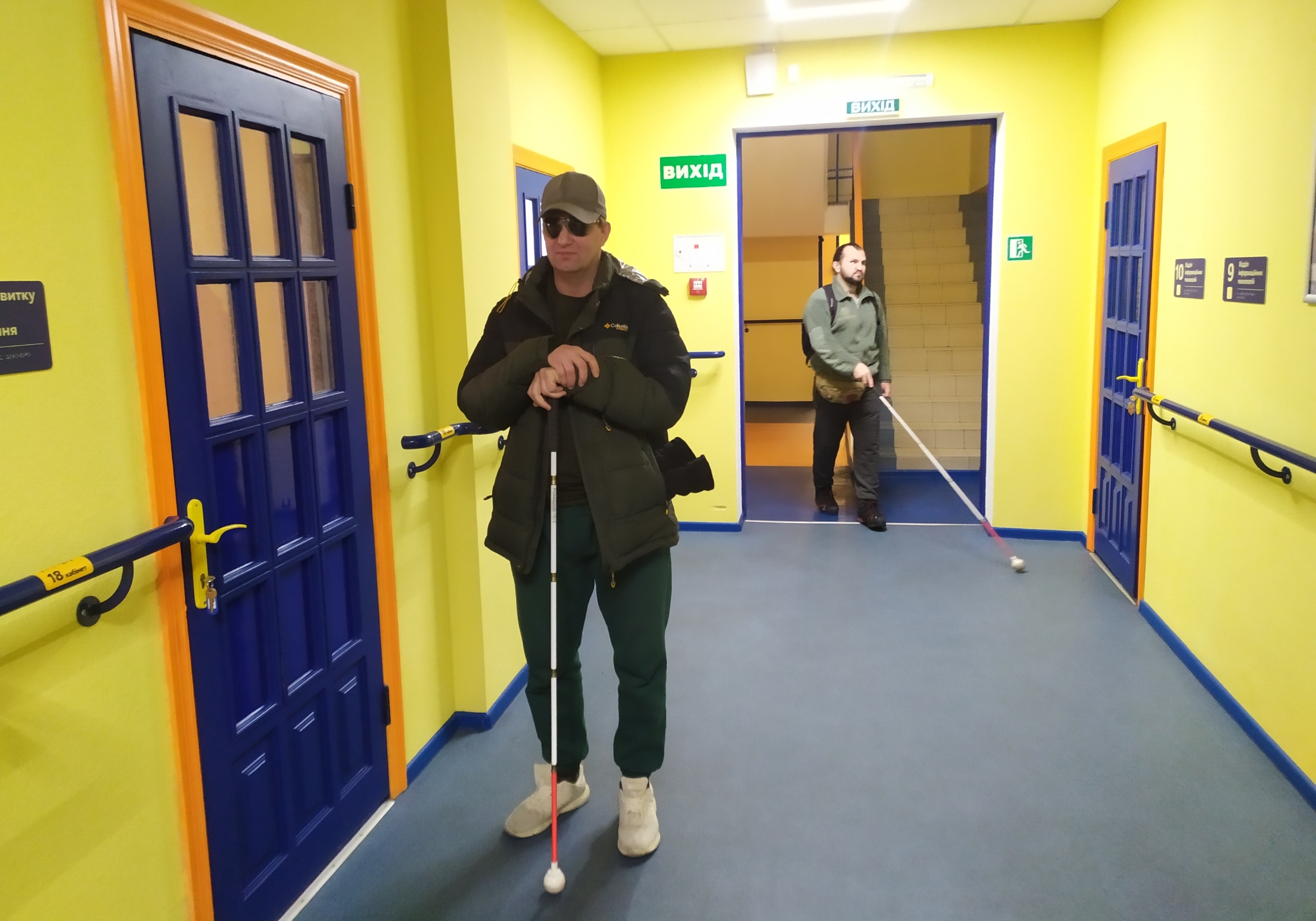 Уздовж яскраво-жовтого коридору – поручні й таблички шрифтом Брайля. Двері теж яскраві – темно-сині з оранжевою лиштвою. Коридором час від часу проходять чоловіки з тростинами, шукаючи потрібні двері, де в них за планом заняття.