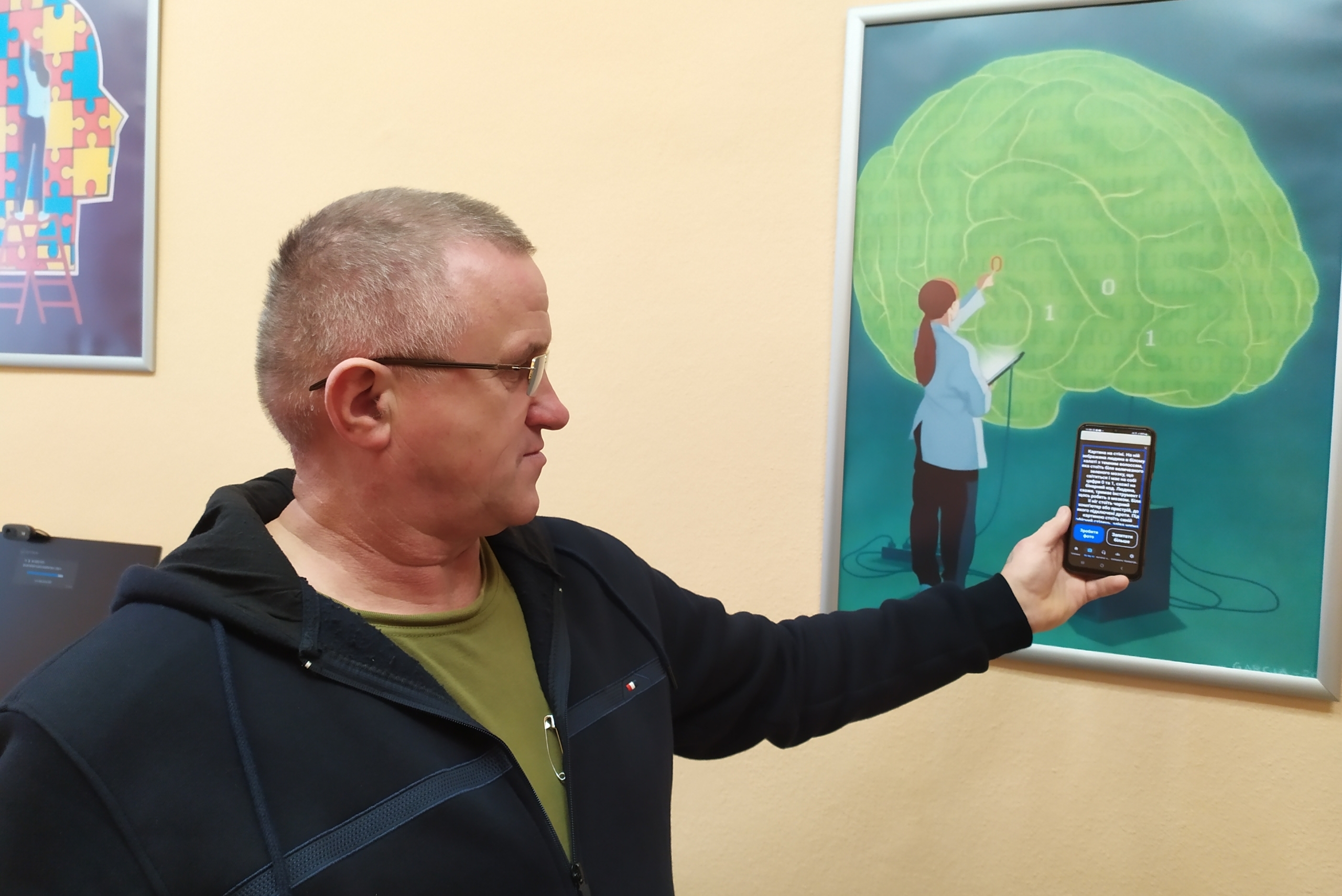Ветеран показує, які програми в телефоні допомагають незрячим орієнтуватися. Зокрема, можна навести камеру на людину чи картину й почути опис зображення.