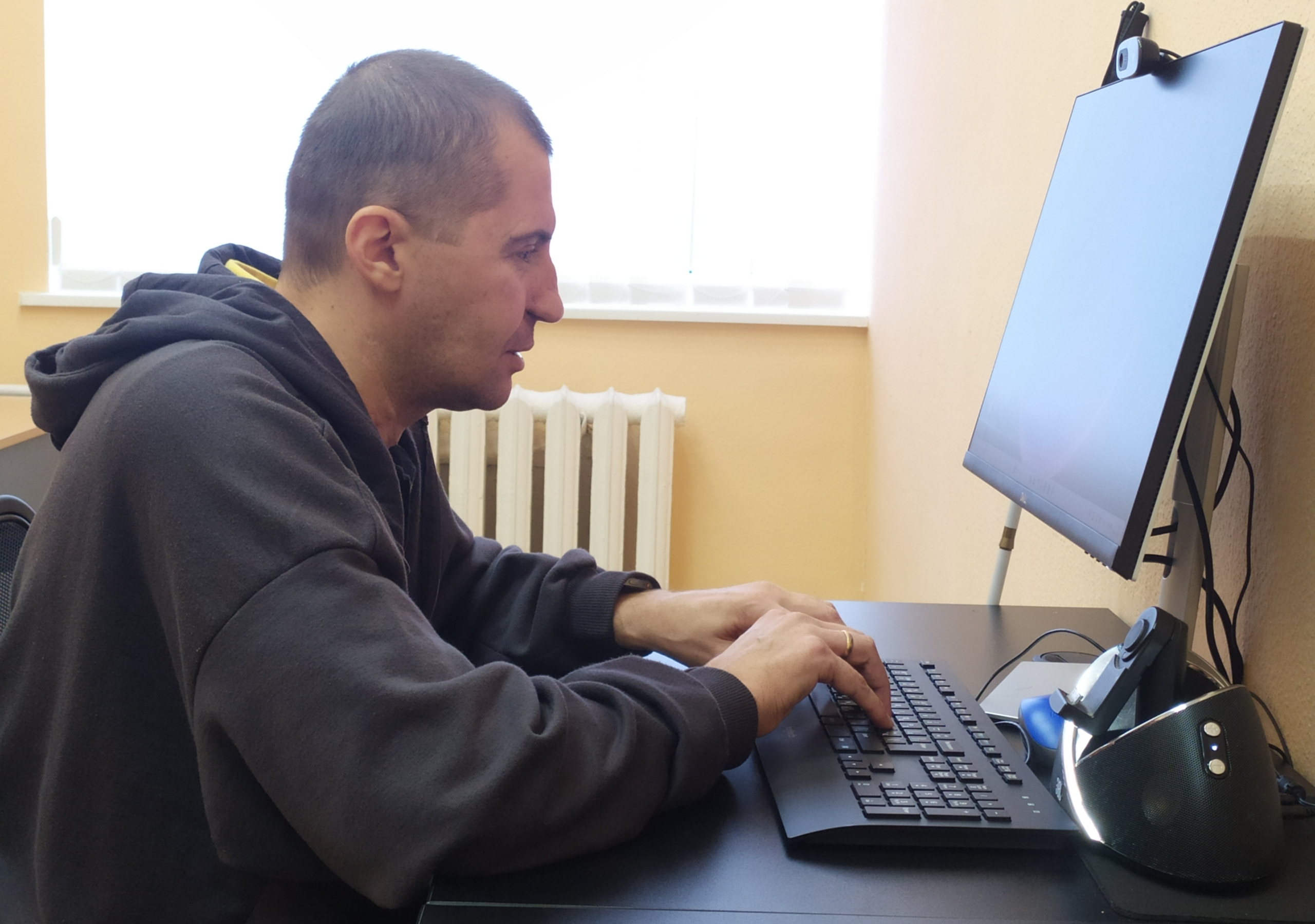 Руслан Афанасьєв служив у роті вогневої підтримки, втратив зір улітку 2024 року на донецькому напрямку, коли в їхню машину влучив FPV-дрон. Він займається за комп’ютером, намагається опанувати “сліпий набір”. Програма дає підказки голосом, якими пальцями натискати. Руслан зосереджений, напружується, каже, що ніколи не користувався так м’язами пальців. Але під час розмови забирає руки від клавіатури й усміхається, жартує.