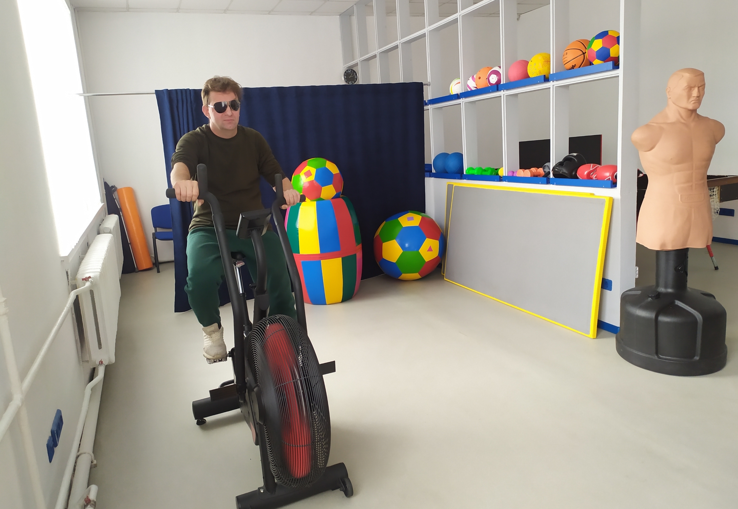 Він прийшов займатися спортом, розминається на велотренажері. Каже, що раніше проходив реабілітацію, вже опанував орієнтування. У Трініті хабі він хоче опанувати роботу на комп’ютері.