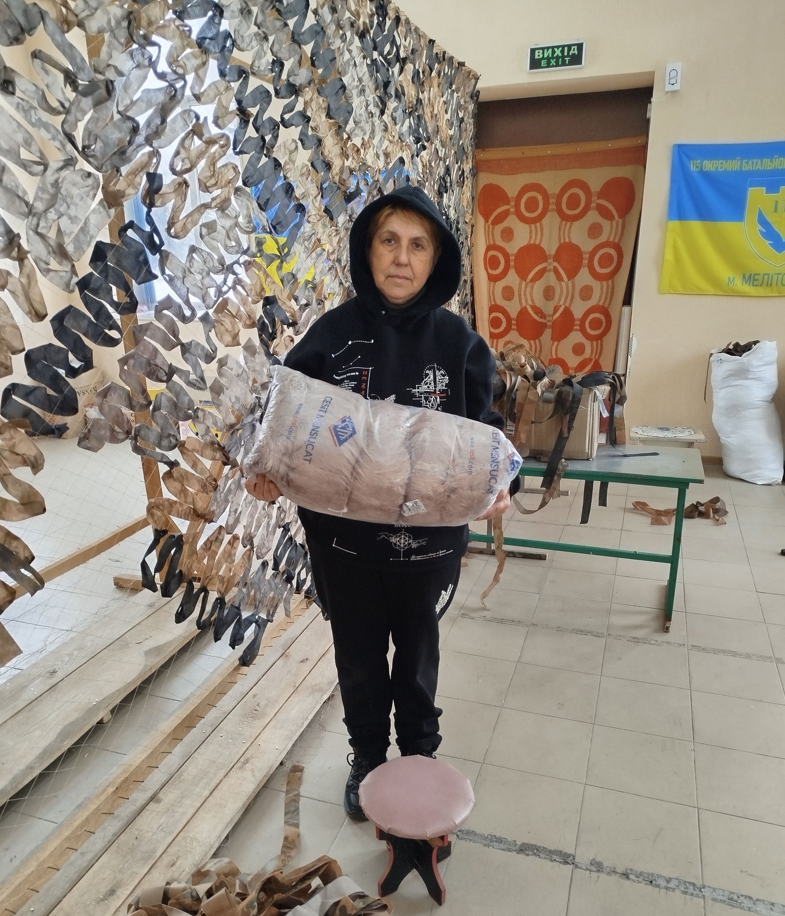 “Вікторія, швачка за фахом, попросила про допомогу. А я ж біолог. Усе знаю про сітки. Маскування – адаптація тварин, щоб хижаки їх не вбили. Зараз ми плетемо для окремого полку, а це фортифікаційні споруди, мости… І ось у таких кольорах – цегляний, сірий, білий, – сітка маскується під глину, землю, будівельне сміття. Накриваєш такою сіткою техніку – і ворог її не помічає. Таких сіток потрібно тридцять, але сьогодні ми можемо відправити тільки одинадцять…”.