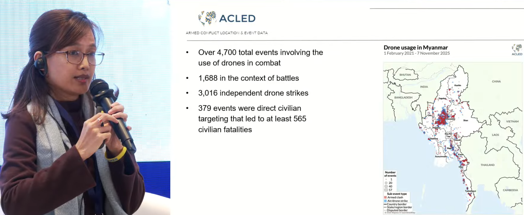 First, I would like to explain what ACLED is. ACLED is an independent, impartial conflict monitor providing real-time data and analysis on violent conflict and protest in all countries and territories across the world. We collect information in over 100 local languages and from over 5,000 sources. ACLED has recorded over 1.5 million events from every country in the world. We produce real-time data, used by journalists, academics, humanitarian, peace, and policy-making organizations. We have a clear, transparent methodology that allows us to compare different conflicts, for example, Ukraine and Myanmar.