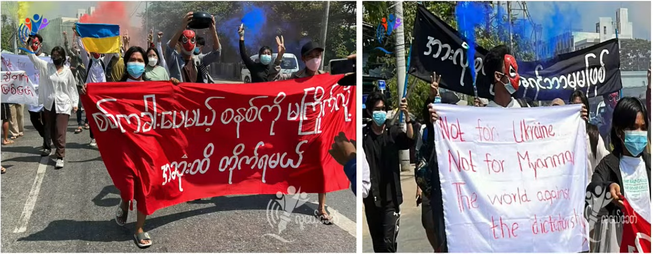 The Russian deputy defense minister was in Myanmar to attend a military parade in March 2022, and young people took to the streets in Yangon against the military coup. They also displayed the Ukrainian flag on this protest as a sign of solidarity with Ukraine in its struggle against Russian aggression. Their message was that they stand with Ukraine and that they are against all kinds of dictatorships.