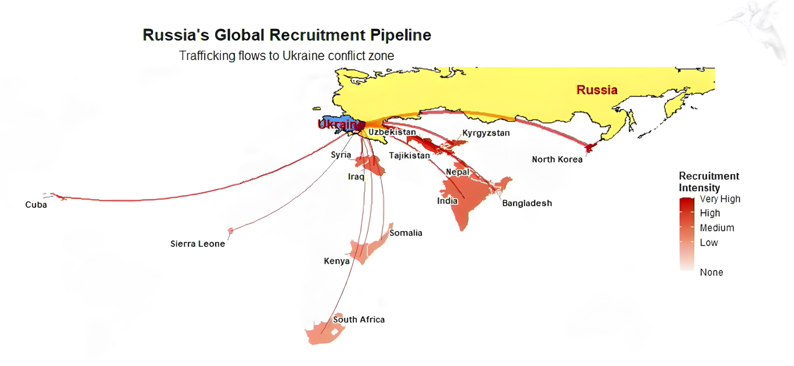 But the network extends far beyond these regions. Syria was reportedly the earliest major source, with recruits sent for training in Russia following the 2022 invasion while Assad was still in power. By late 2023, Cuba’s own foreign ministry had uncovered human trafficking rings recruiting Cuban nationals.