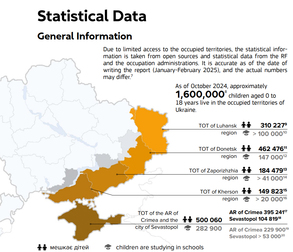 Data on the number of children reflects the situation as of October 2024. Of the total, 590,000 are already studying in institutions that have been illegally transitioned to teaching according to Russian standards.