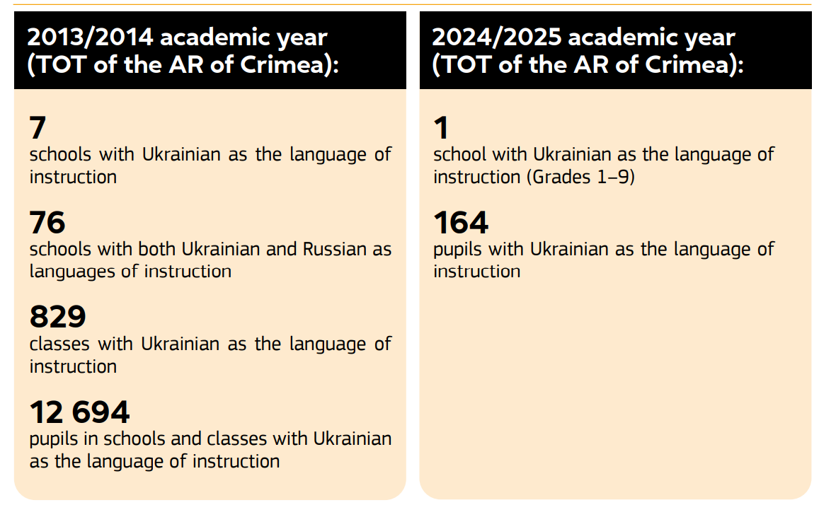Only 197 children are studying Ukrainian in the temporarily occupied Crimea. In contrast, in 2013–2014, there were over 12,000 such students. The only school in Crimea where Ukrainian was supposed to be officially taught does not do so.