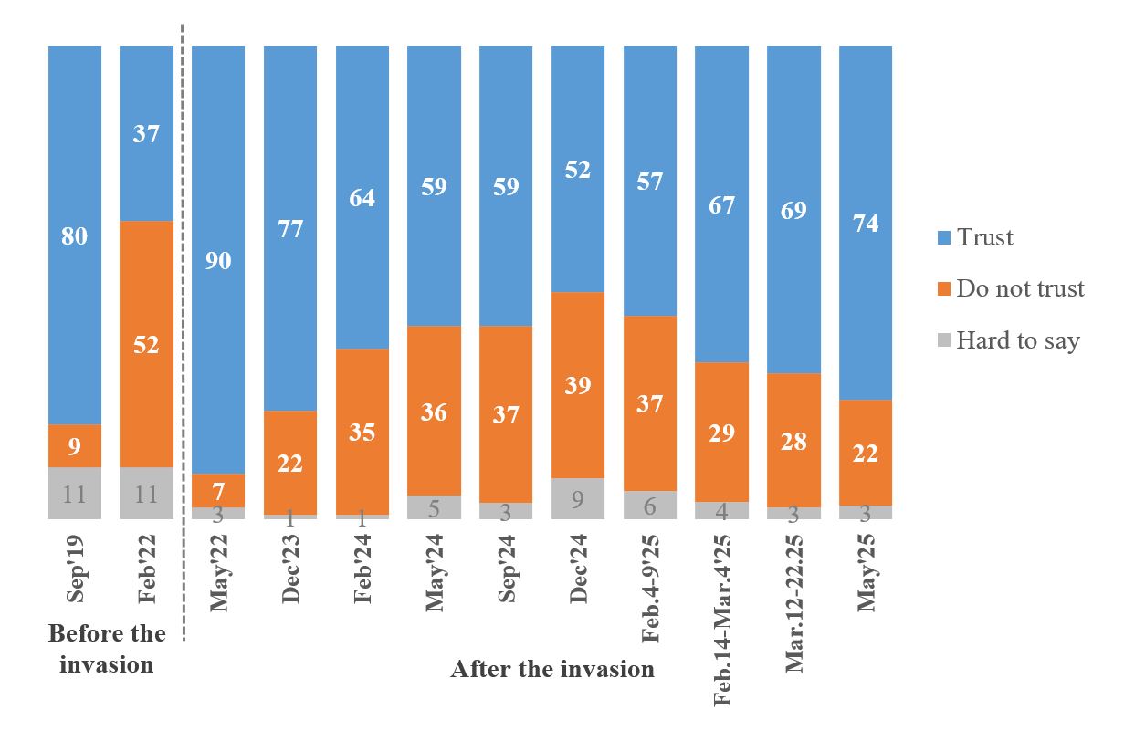 Compared to March 2025, the level of trust in the president rose by five percentage points (from 69% to 74%), while distrust fell from 28% to 22%. Accordingly, the balance improved from +41% to +52%.
