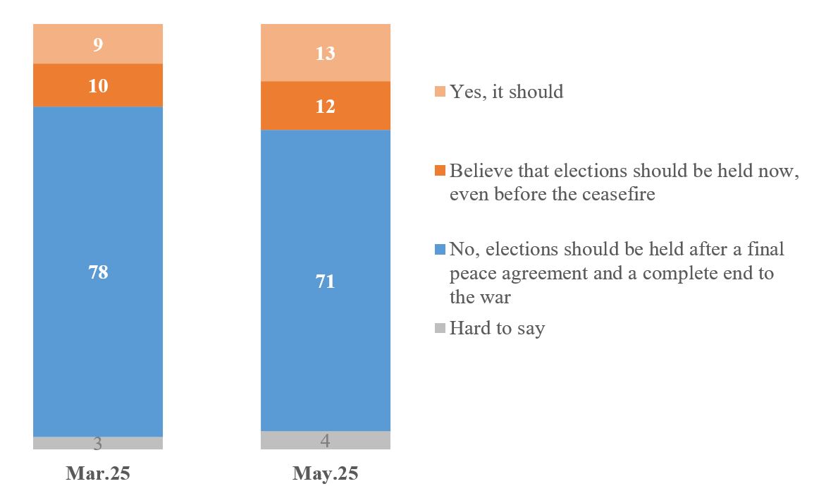 Nonetheless, the proportion of those who believe elections should be held only after the war has fully ended dropped from 78% to 71%.