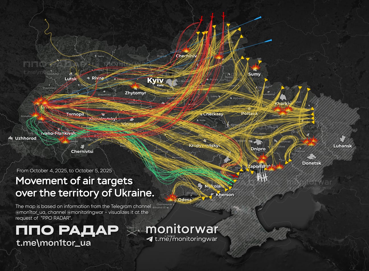 President of Ukraine Volodymyr Zelenskyy reported that Russia launched more than 50 missiles and around 500 attack drones against Ukraine on the night of October 4-5, targeting Lviv, Ivano-Frankivsk, Zaporizhzhia, Chernihiv, Sumy, Kharkiv, Kherson, Odesa, and Kirovohrad oblasts. Ukraine’s Air Force reported intercepting 478 targets, but eight missiles and 57 attack drones hit their targets across 20 locations.