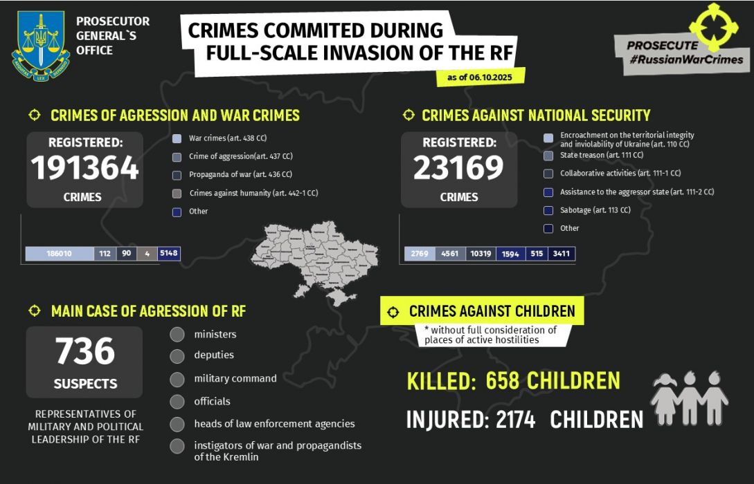 As of October 6, 2025, Ukrainian law enforcement agencies have registered 191,364 crimes of aggression and war crimes committed by Russian forces since the start of the full-scale invasion. These include violations under Article 438 of Ukraine’s Criminal Code (war crimes), Article 437 (crime of aggression), Article 436 (propaganda of war), and Article 442-1 (crimes against humanity).