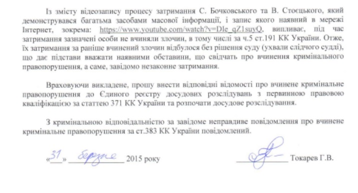 25 березня на очах багатомільйонної телевізійної аудиторії на засіданні Кабінету Міністрів України за підозрою у вчиненні злочину правоохоронці затримали без ухвали слідчого судді на підставі статті 208 КПК України голову Державної служби з надзвичайних ситуацій С. Бочковського та його заступника В. Стоєцького.