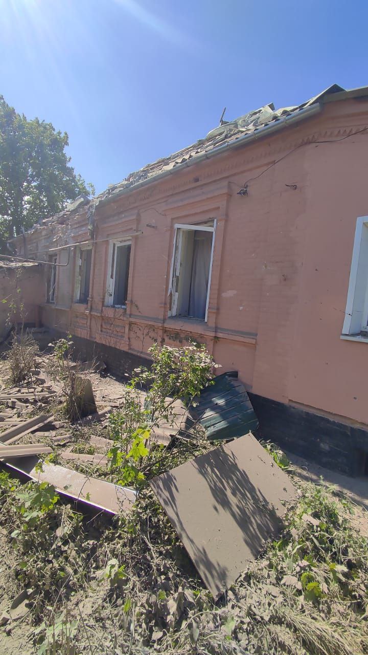 Наслідки російської атаки на Нікопольщині. Фото: телеграм-канал Сергія Лисака“Агресор цілив по Нікопольщині FPV-дронами та артилерією. Бив по райцентру, Марганецькій і Мирівській громадах. Постраждала 62-річна жінка. Лікуватиметься амбулаторно. Пошкоджені 4 приватні будинки. Один з них зайнявся. Рятувальники пожежу загасили”, – йдеться в дописі.