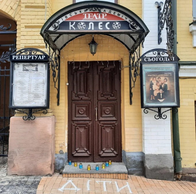 Фото: Олександра Єфименка / “Громадське радіо”Перед будівлею “Українського Малого драматичного театру” залишили напис “діти”, як колись було перед Маріупольським драмтеатром, зазначивши, що треба пам’ятати та боротися, аби Росія відповіла за злочини перед людством.