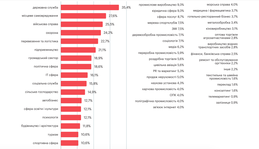 Розподіл відповідей ветеранів та ветеранок щодо роботи, яку вони хотіли б отримати. Скриншот сторінки дослідженняДо трійки найпопулярніших сфер також потрапила військова справа (25,5%). Торік серед опитаних ветеранів та військових тих, хто хотів би лишитись у війську після звільнення, було менш як 10%.