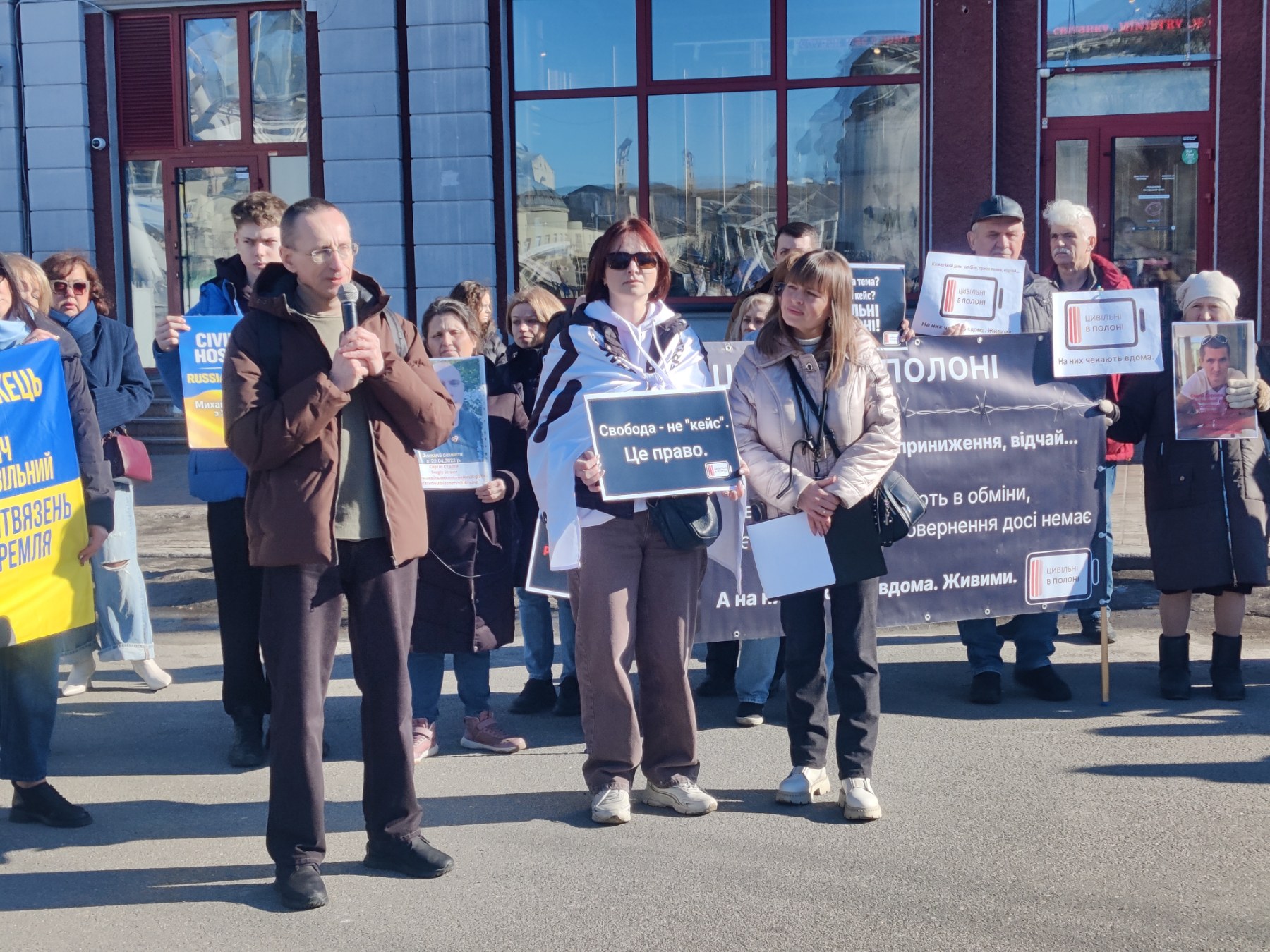 Джерело: ZMINAДо заходу долучилися близько сотні родичів цивільних бранців з різних куточків України. Вони вкотре нагадали про своїх близьких, яких роками незаконно утримують у російських в’язницях.