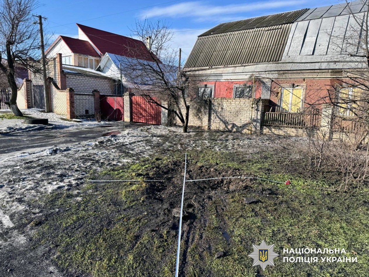 Слід від влучання російського снаряда поблизу житлових будинків на ХерсонщиніОкрім них поліції стало відомо про п’ятьох травмованих росіянами 28 січня. Мова йде про трьох жительок Білозерки та двох херсонців.