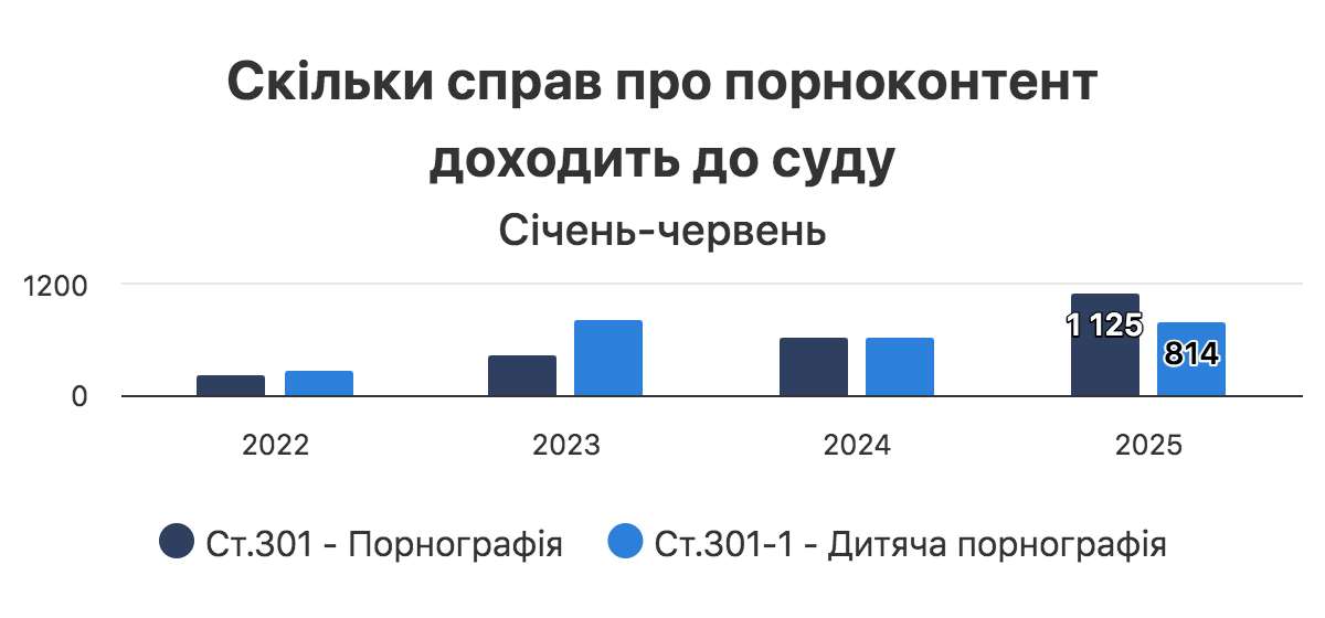 Інфографіка ОпендатаботВ Україні не поодинокі випадки, коли людей за звинуваченнями у розповсюдженні чи виготовленні порно судять за надсилання інтимних матеріалів між знайомими людьми, а таку практику критикують правозахисники.