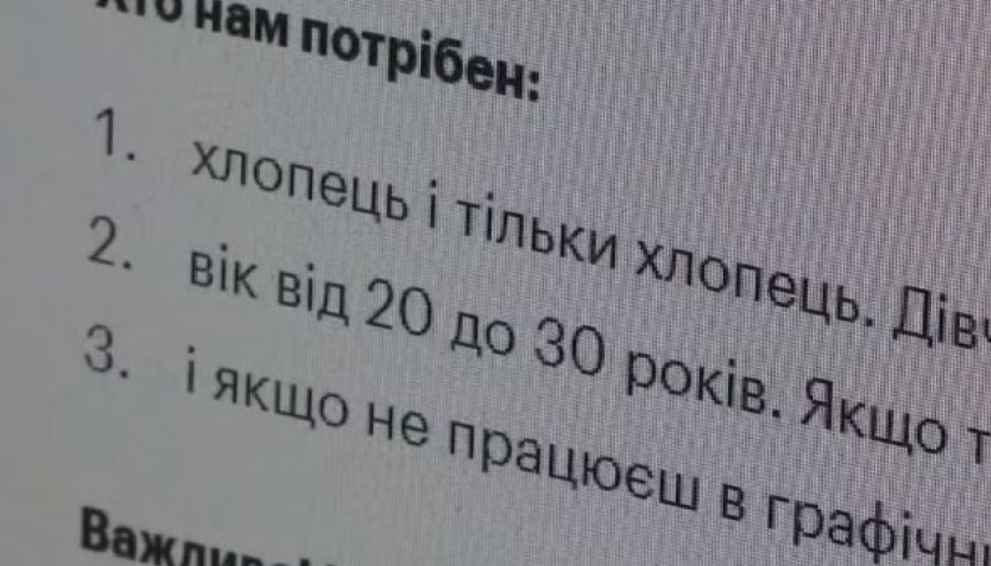 Ілюстраційне зображення дискримінаційної вакансії. Скриншот репортажу телеканалу 1+1Велика війна загострила наявні проблеми у сфері праці, й попри позитивні зрушення досі чимало людей стикаються з дискримінацією під час пошуку роботи.