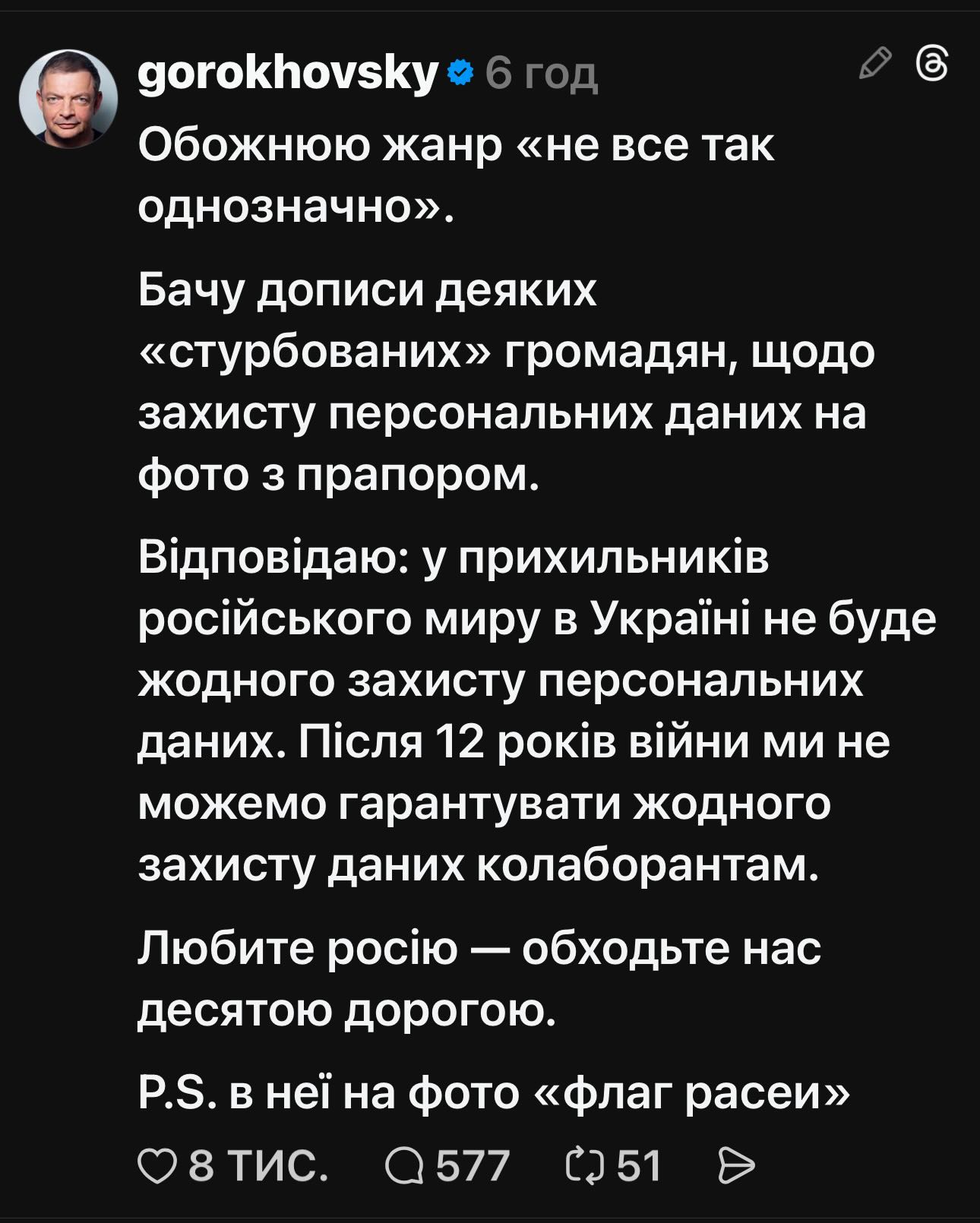“Бачу дописи деяких “стурбованих” громадян щодо захисту персональних даних на фото з прапором. Відповідаю: у прихильників російського миру в Україні не буде жодного захисту персональних даних. Після 12 років війни ми не можемо гарантувати жодного захисту даних колаборантам. Любите Росію – обходьте нас десятою дорогою. P. S. В неї на фото “флаг расеи”.