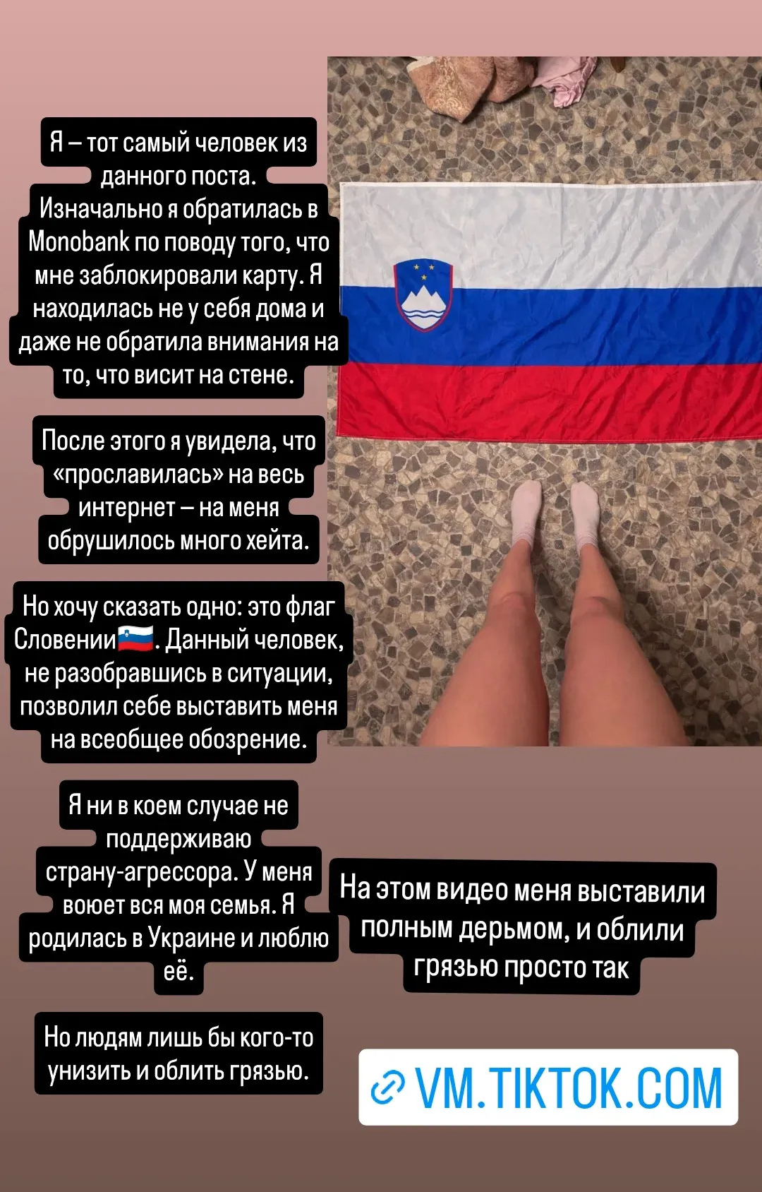 Дівчина розповіла, що проходила перевірку банку, перебуваючи в Німеччині. Під час відеодзвінка вона була в гостях у подруги зі Словенії, де на стіні висив прапор її країни. Ба більше, вона сказала, що хоча й веде соцмережі російською, але не підтримує РФ, а в ЗСУ нині служить уся родина.