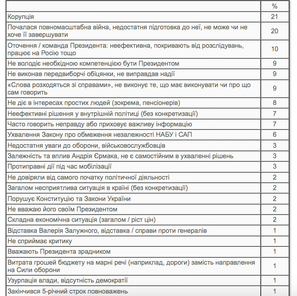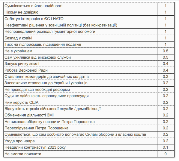 По 7% винуватять Зеленського в хибних управлінських рішеннях та в тому, що він “часто говорить неправду або приховує важливу інформацію”.