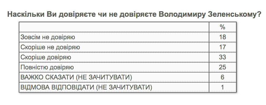 Серед опитаних українців 58% довіряють президенту Володимиру Зеленському, а ще щонайменше 35% – не довіряють.
