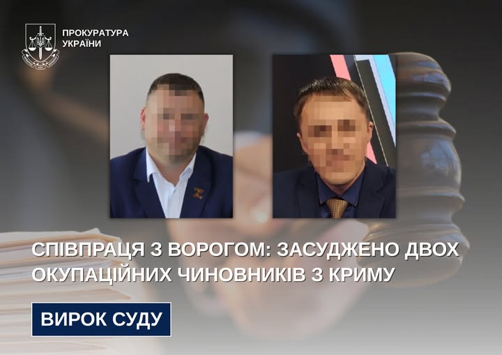 Двох окупаційних чиновників з Криму визнали винними в колабораційній діяльності й засудили до восьми років ув’язнення з конфіскацією майна (заочно).