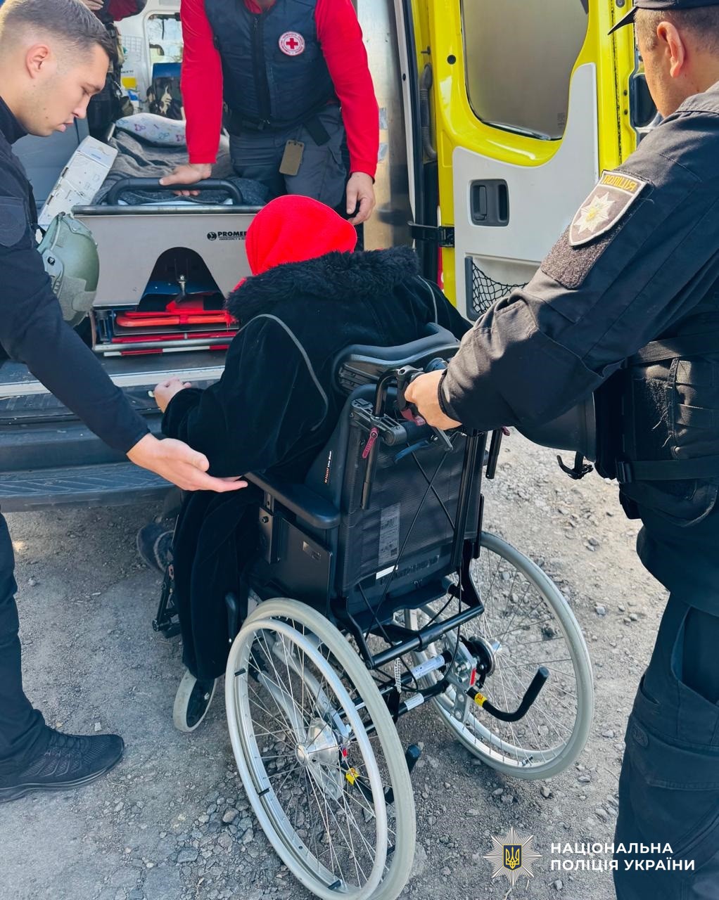 Поліціянти допомагають літній жінці на кріслі колісному сісти в автівку швидкоїНа Харківщині з-під обстрілів РФ вивозили літню матір з дорослим сином.