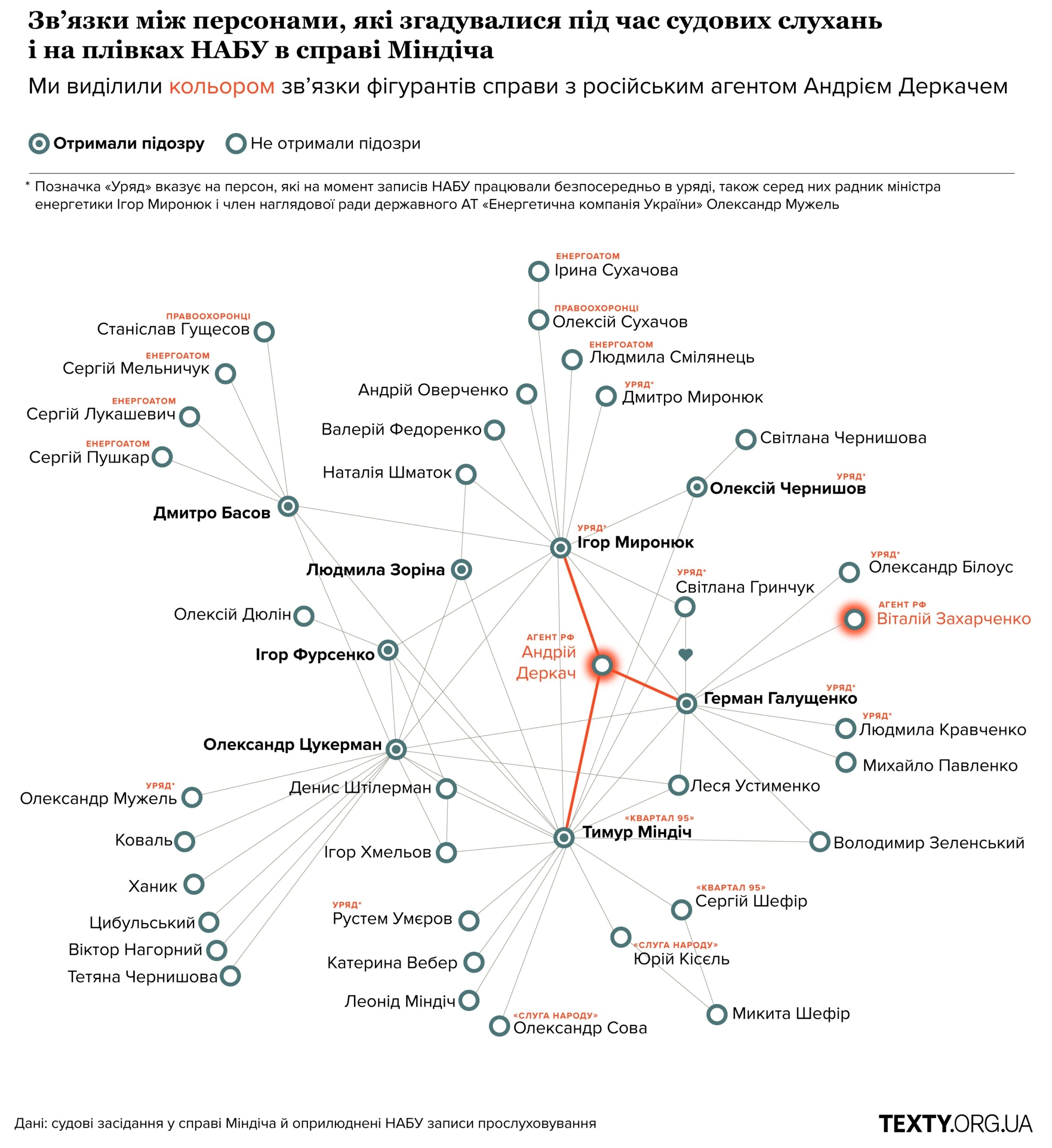 Журналісти “Схем” уточнили, що в справі йдеться про Тимура Міндіча, ексрадника міністра енергетики Ігоря Миронюка, виконавчого директора з безпеки “Енергоатому” Дмитра Басова та чотирьох співробітників так званого бекофісу з легалізації коштів: Олександра Цукермана, Ігоря Фурсенка, Лесю Устименко та Людмилу Зоріну.