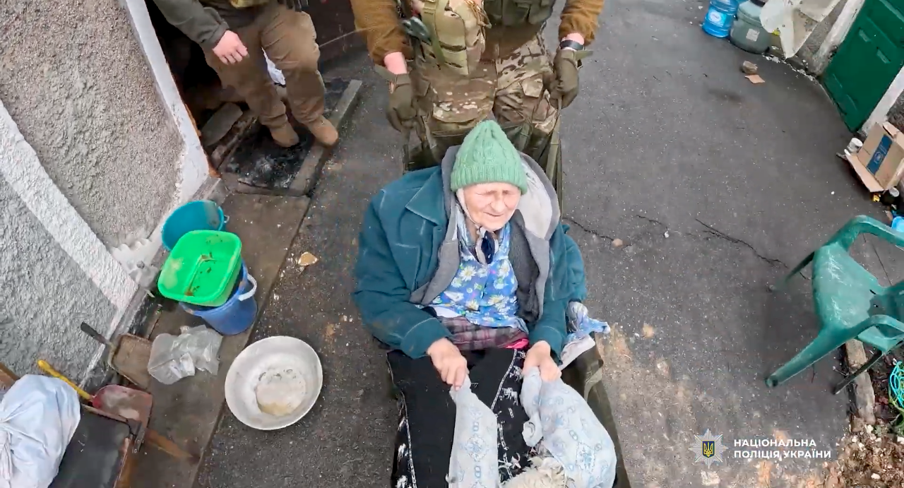 Евакуаційний екіпаж допомагає літній мешканці Покровська дістатися до броньованого авто, щоб відвезти її до лікарні. Скриншот відеоНаселений пункт майже повністю зруйнований щоденними обстрілами, а через таку активність армії РФ до міста складно завезти гуманітарну допомогу й вивозити цивільних.
