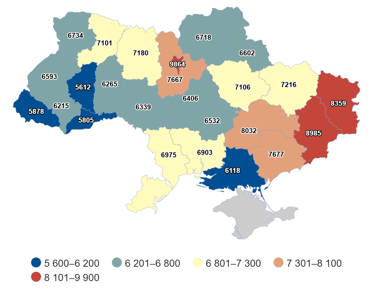 Найвищі пенсії традиційно у Києві — в середньому, 9,8 тисячі гривень. Найнижчі — на Тернопільщині, де середня виплата становить 5,6 тисячі гривень. Загалом лише у 8 регіонах пенсії сягають середнього рівня або навіть є вищими, кажуть дослідники.