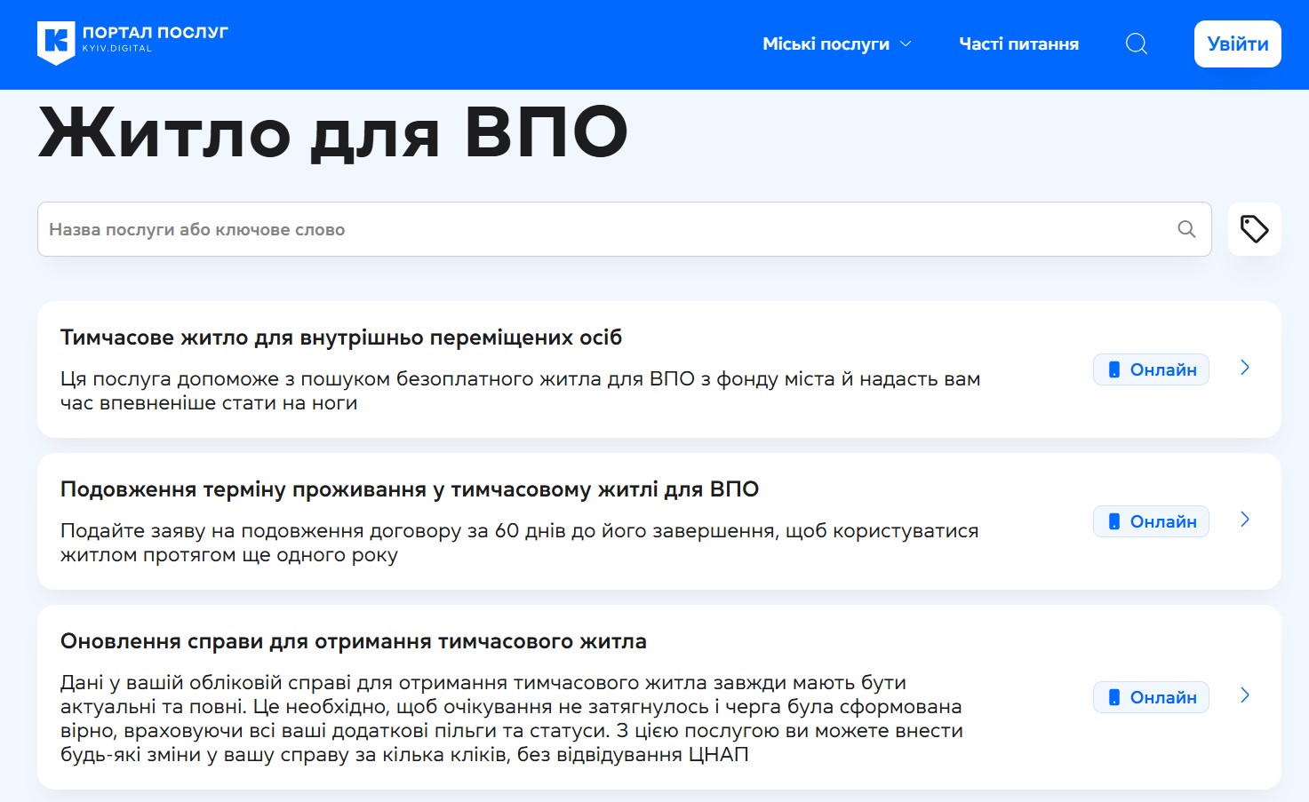 Послуги житла для ВПО, доступні на порталі послуг “Київ Цифровий”. СкриншотТимчасове житло для ВПО шукає безоплатну оселю з фонду міста на час, поки переселенець чи його родина стане на ноги. Послуга доступна для тих, хто має довідку ВПО та перебуває на обліку в місті Києві. Заява на житло подається онлайн (офлайн також можна прийти в ЦНАП), безоплатно, розглядається 10 днів.