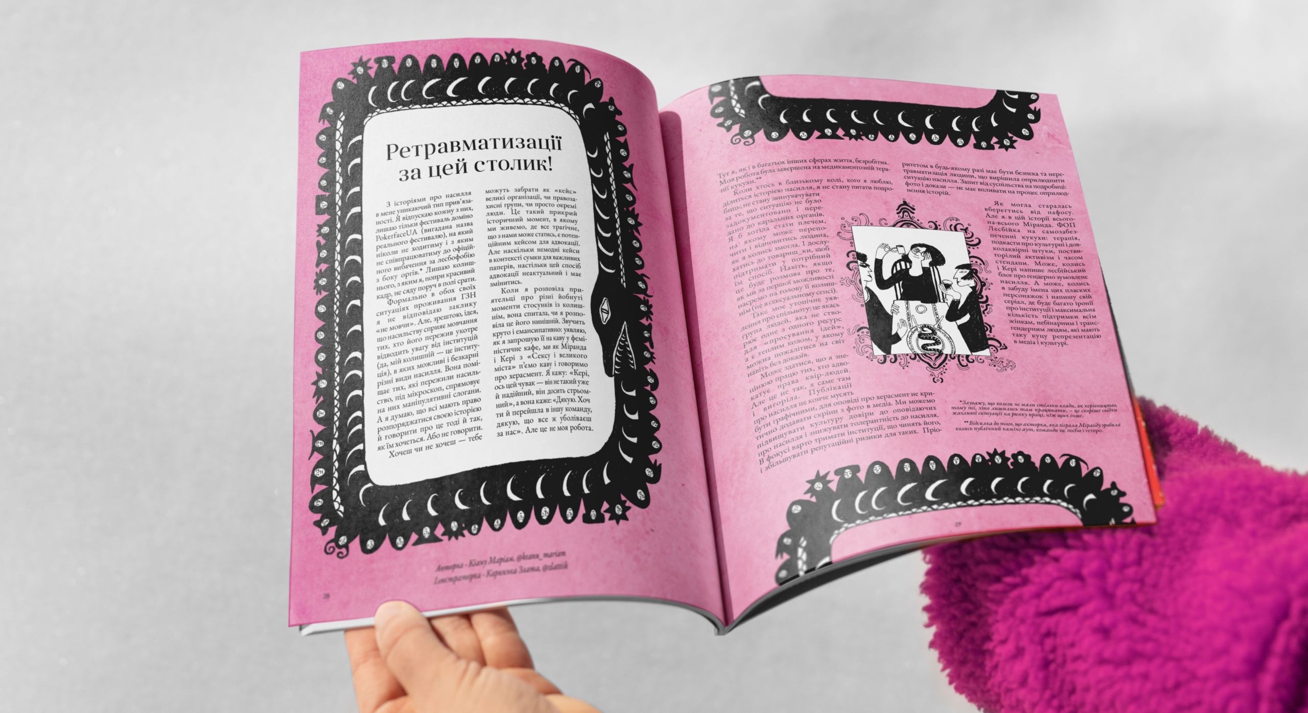 До журналу увійшли п’ять особистих історій постраждалих, добірка організацій, які працюють із темою насильства щодо лесбійок, а також формат бінго, що ілюструє ознаки гармонійних і токсичних стосунків.