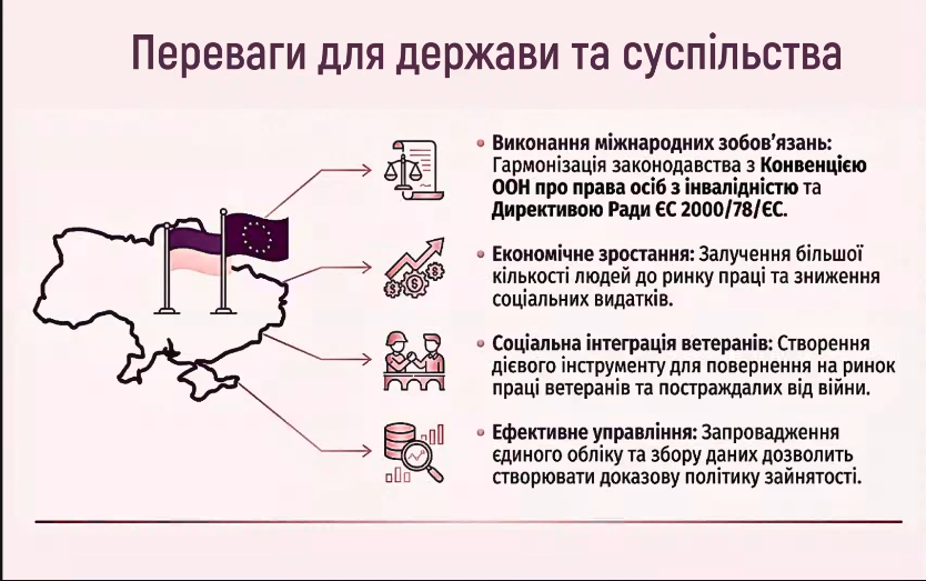 З 1 січня 2026 року набув чинності євроінтеграційний закон про гарантії осіб з інвалідністю у сфері працевлаштування (№4219-IX), який передбачає нові механізми підтримки в працевлаштуванні.