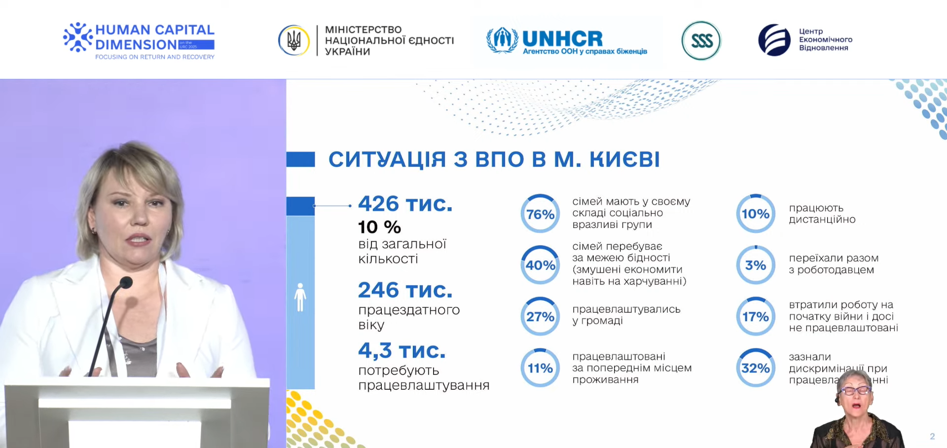 Говорячи про основні виклики ринку праці в столиці, Ольга Алтуніна виділила три категорії. Перша – невідповідність кваліфікаційним потребам ринку Києва, адже ВПО до столиці приїхали здебільшого з Донецької, Луганської і Харківської областей і не мають досвіду роботи, представленого в Києві. Такі переселенці мають досвід в аграрному секторі, секторі важкої, переробної промисловості або видобування корисних копалин, утім не можуть використати його в столиці.
