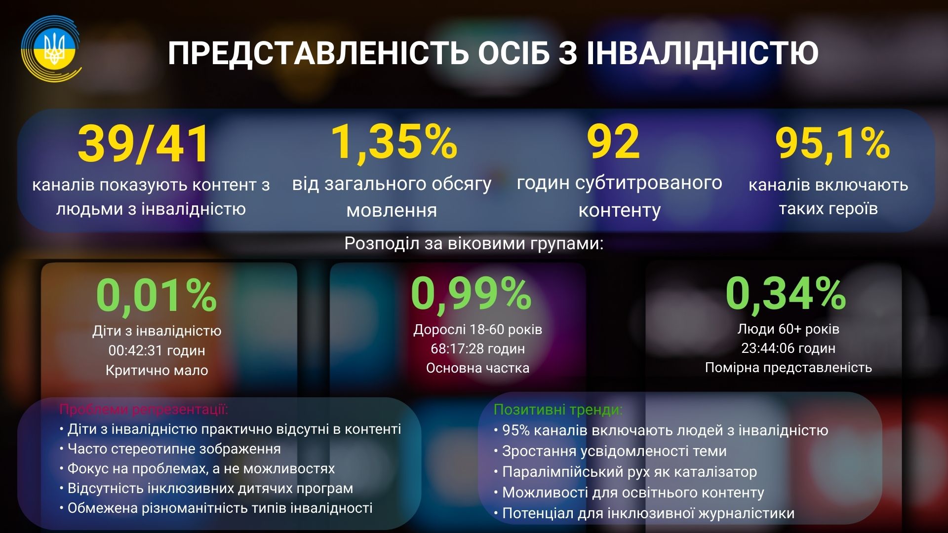 Окремо досліджували представленість людей з інвалідністю в медіаконтенті. Їхня частка становить лише 1,35% з усіх програм. Діти з інвалідністю з’являються в 0,01% контенту, дорослі – у 0,99%, люди літнього віку – у 0,34%.