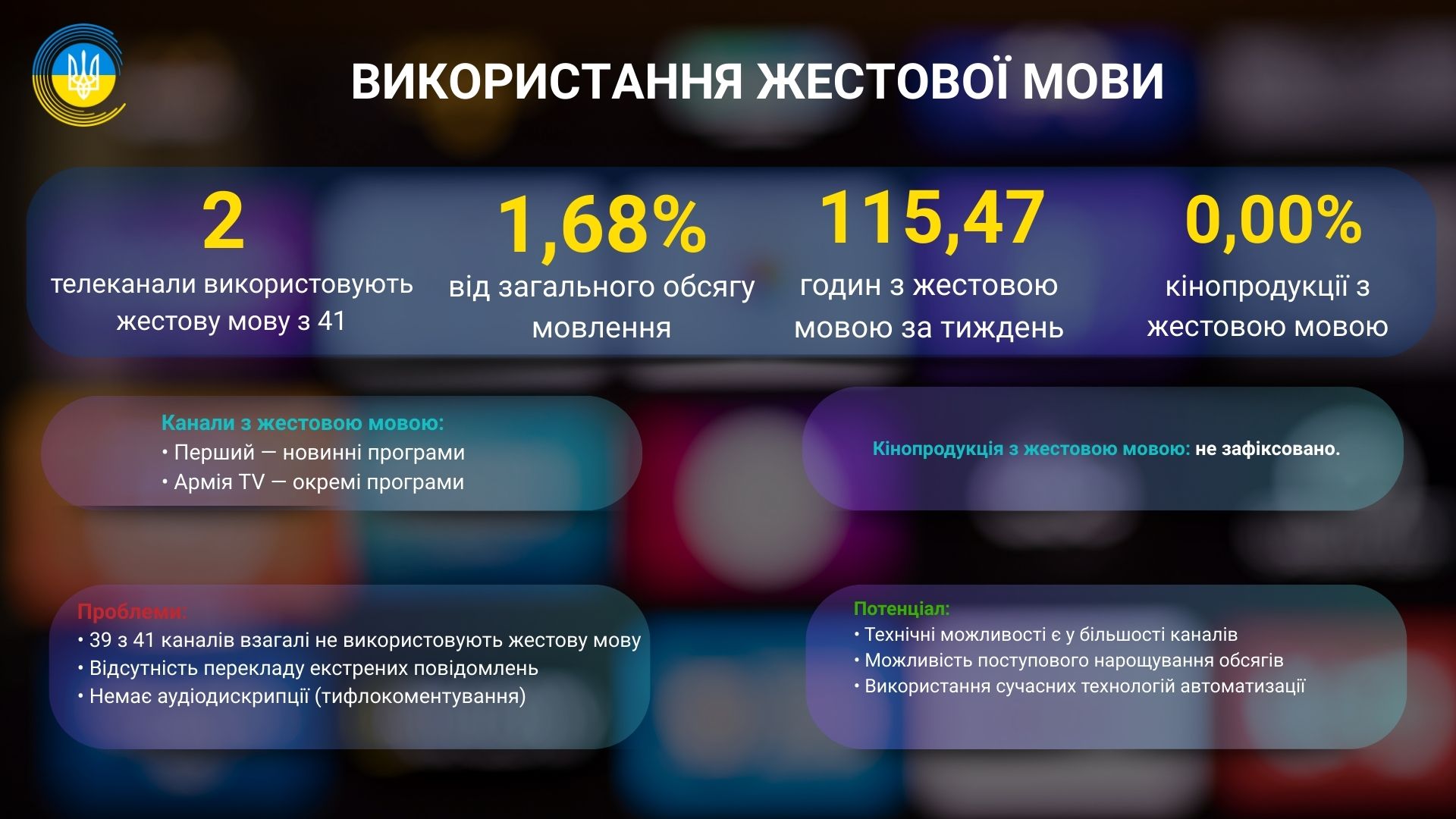 23 вересня, у Міжнародний день жестових мов, Національна рада з питань телебачення і радіомовлення презентувала результати моніторингу 41 загальнонаціонального телеканалу. Дослідження показало, що лише 2,3% ефірного часу супроводжується перекладом жестовою мовою, а доступної кінопродукції немає зовсім.