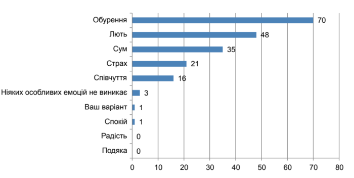 Коли респонденти чують про випадки депортації дітей до РФ, то здебільшого відчувають обурення (70%), лють (48%) та сум (35%).