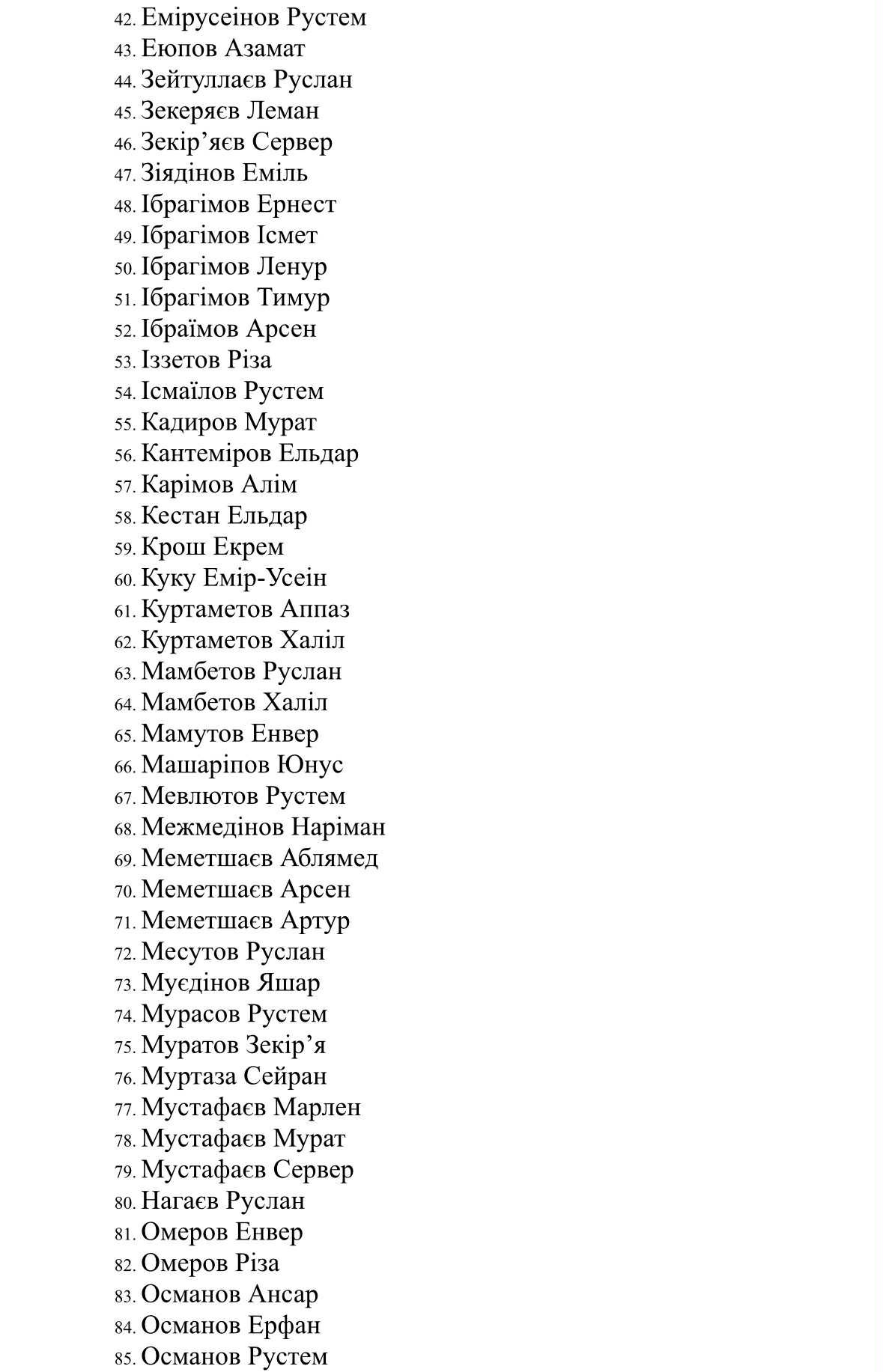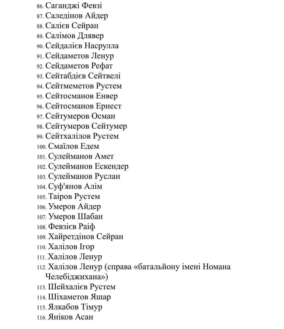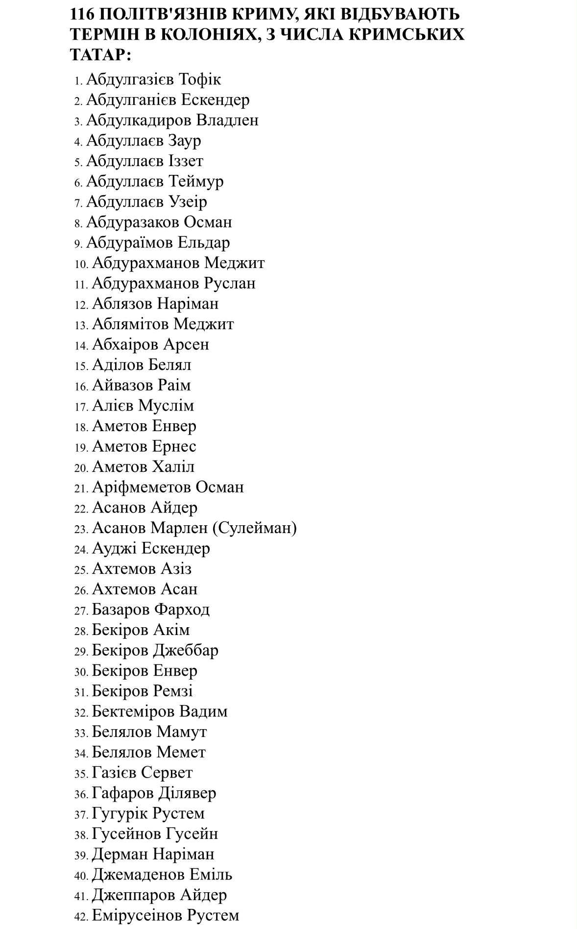 Незаконне покарання в пенітенціарних установах окупантів відбувають щонайменше 116 кримських татар (перелік див. нижче).