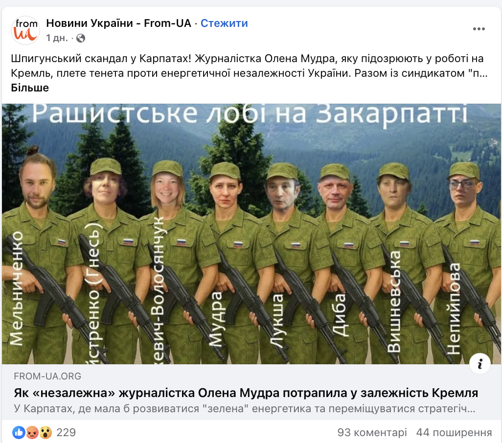 Так, особливої популярності набуло змонтоване зображення, де Мудра та інші публічні особи зображені у формі російських військових, з підписом: “Рашистське лобі на Закарпатті”. Матеріал супроводжують тези про “зраду”, “отруєне майбутнє Карпат” та натяки на фінансування з боку РФ.