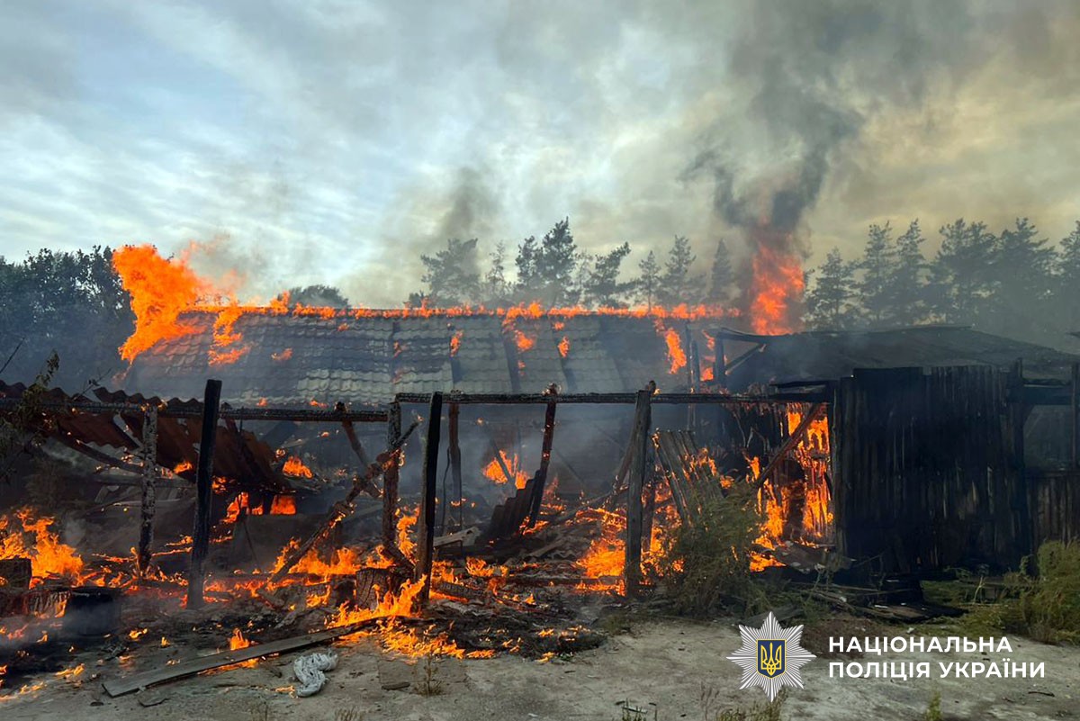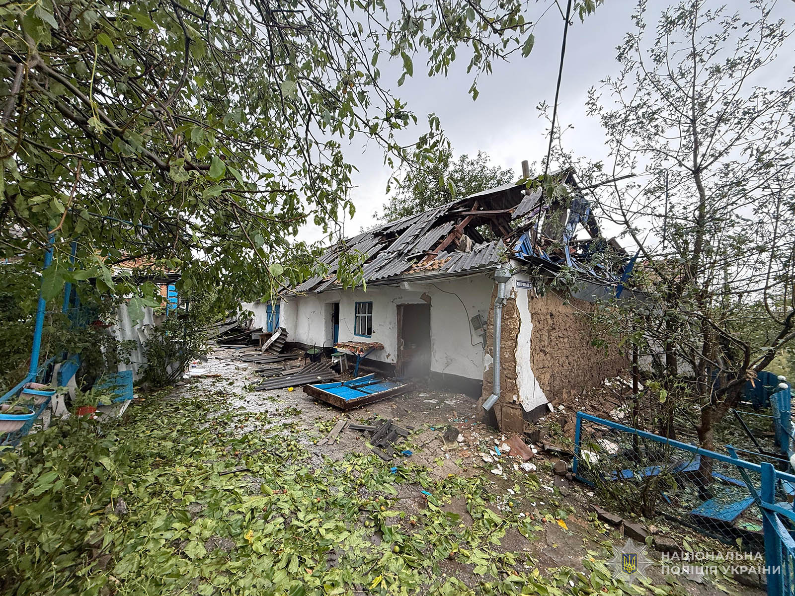 Обстріляний приватний будинок на Дніпропетровщині. Фото: НацполіціяБез жертв та потерпілих минулось 128 вересня на Херсонщині та Дніпропетровщині, але там лишилось руйнування, зокрема понівечено газопровід, об’єкти критичної інфраструктури, сільськогосподарську техніку та приватні будинки.