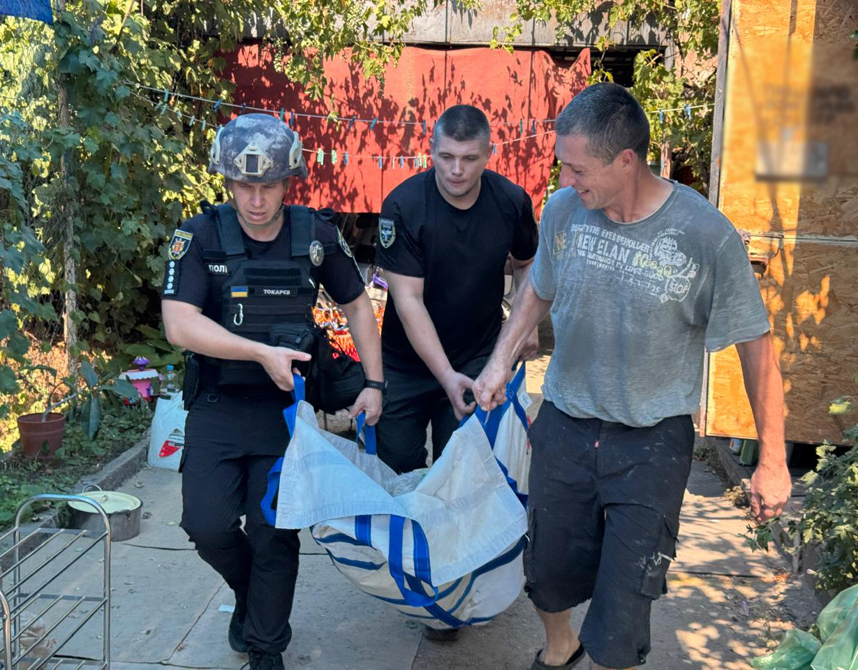 Поліціянти та цивільний чоловік у Запорізькій області несуть травмованого до автівки, щоб перевезти до лікарів. Фото: НацполіціяДвоє загиблих за добу – мешканці Софіївки на Донеччині, по яких російські військові спрямували дрон, яким віддалено управляв оператор. Люди у момент атаки були поряд з будинком, а внаслідок атаки постраждав ще один цивільний.