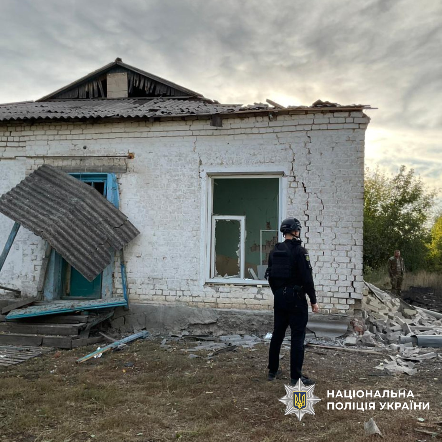 Поліціянт стоїть поряд з понівеченою росіянами будівлею на ХарківщиніБез жертв минула доба на Харківщині та Дніпропетровщині, але там дістали поранення загалом дев’ятеро людей.
